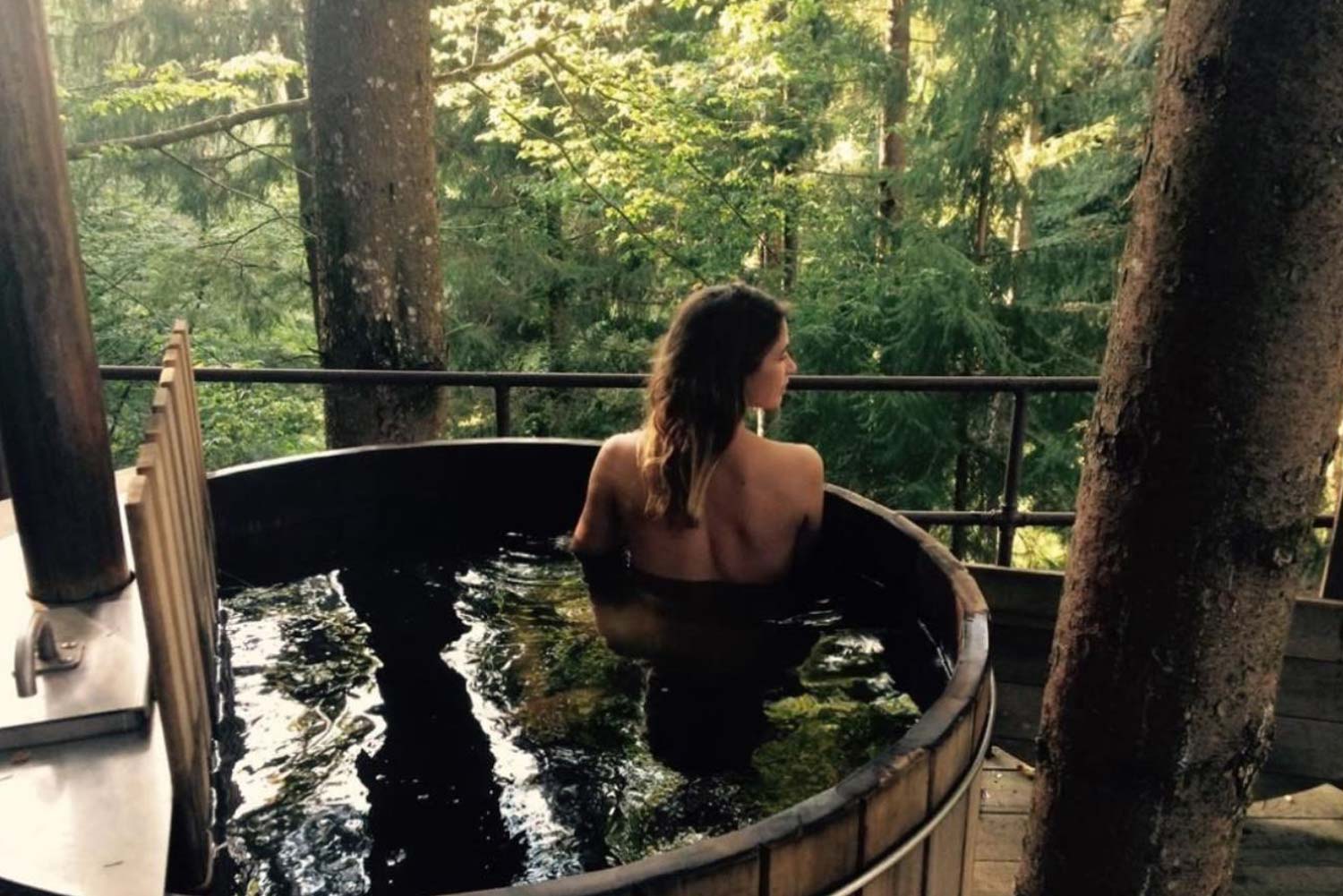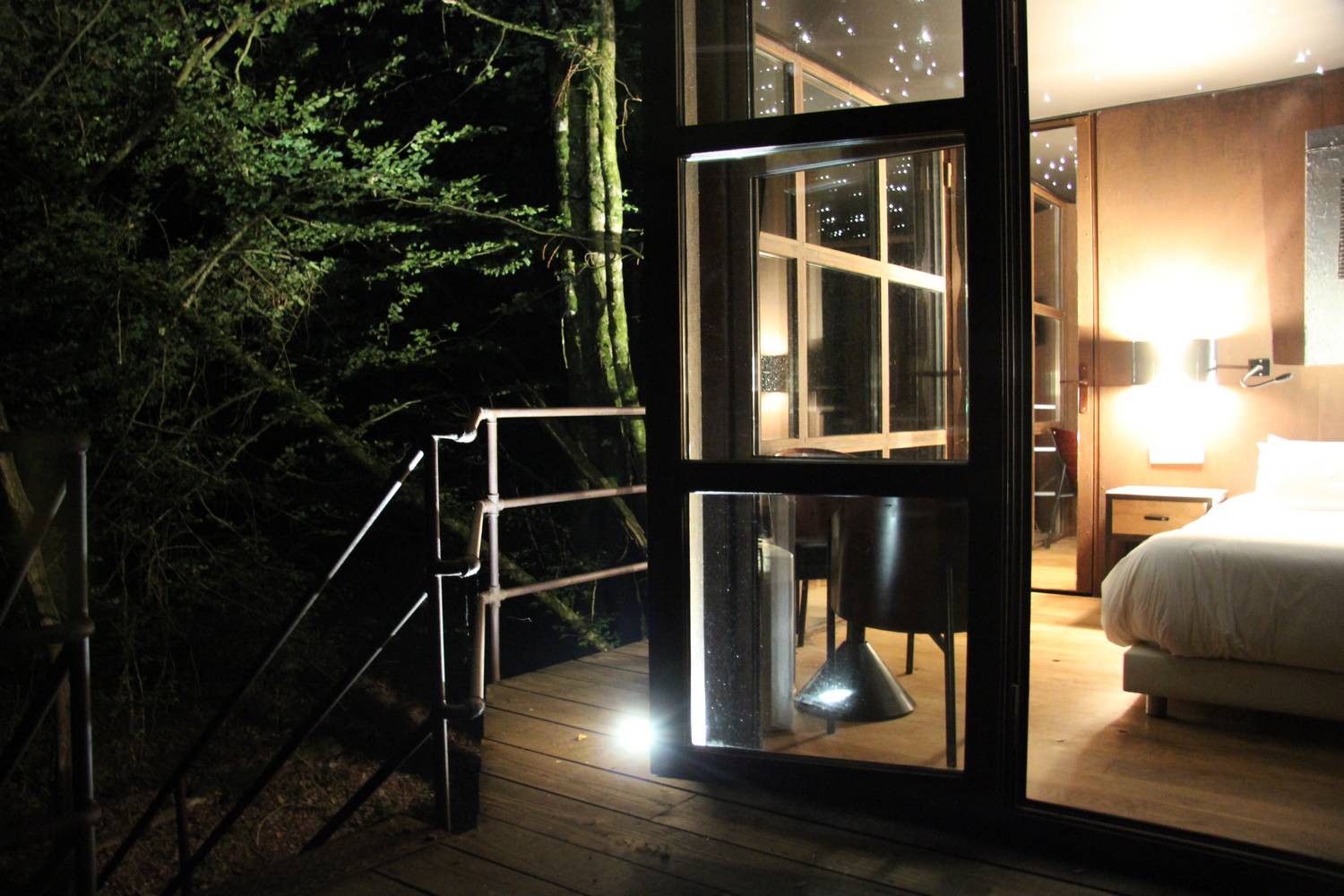 Nous en avons rêvé, et vous offrons notre rêve. Amoureux du design, férus des matières et matériaux, cette cabane abrite le parfait équilibre dans l'utilisation du verre et du bois ensemble sublimés par les tonalités exceptionnelles de l'acier Corten. Cubique et épurée, elle vous accueille dans un très grand confort ou chaque détail a soigneusement été étudié pour créer un style unique. Une salle de bains avec sèche cheveux, un mini bar et sa machine à café Nespresso agrémentent la cabane et, c'est sur sa grande terrasse, subtilement intégrée à la nature, que vous vivrez un moment magique de bien être et de volupté dans votre SPA Nordique privatif chauffé à 38°. Le lit en 160 se voit surmonté d'un ciel étoilé, tandis que, en parfaite immersion grâce aux murs entièrement vitrés, vous profiterez pleinement de cet environnement de verdure, à l’abri des regards, là haut, tout en haut des arbres.