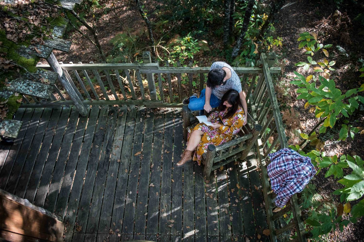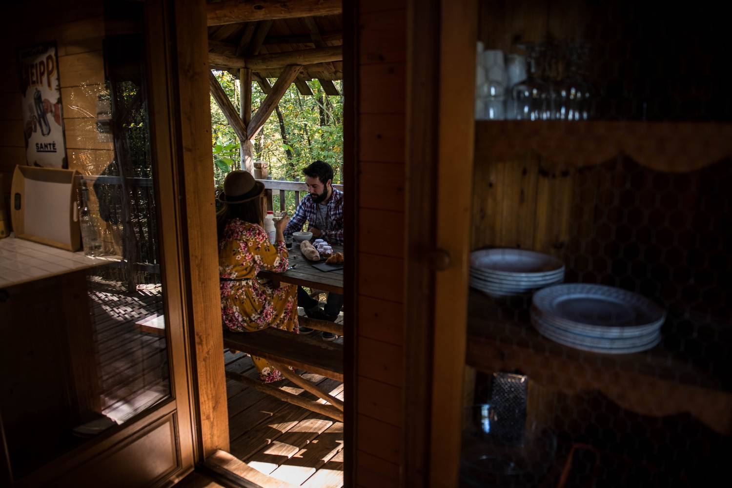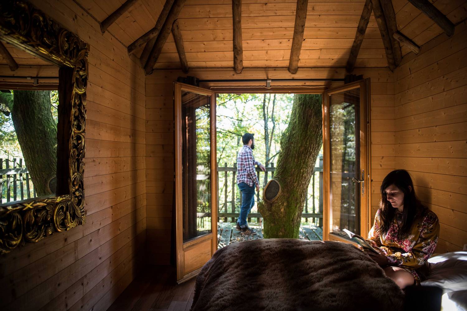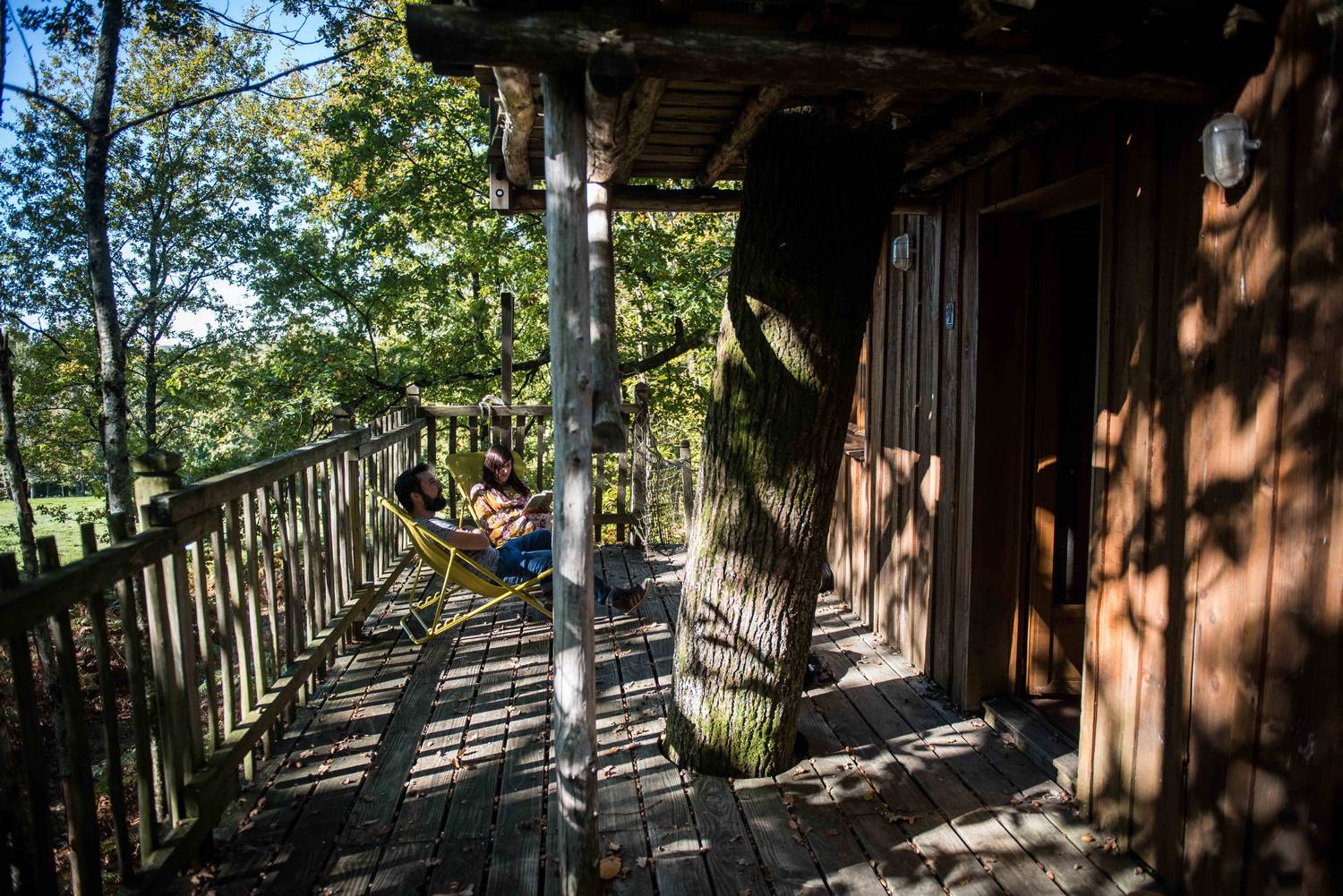Cette cabane en pleine forêt est exposée plein sud avec vue sur des prairies vallonnées où parturent des vaches. Un chêne traverse les terrasses.