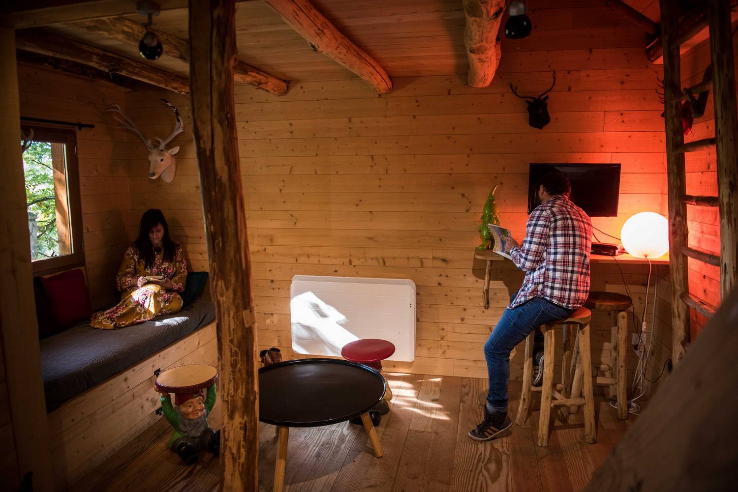 Elle se compose d’un salon et de 2 chambres. La première, située à l’étage, dispose d’un grand lit (en 140) avec sa propre terrasse, la seconde en mezzanine avec 2 lits en 80, une cabane dans la cabane. Un lit gigogne dans la partie salon. Petite cuisine avec frigo et plaques gaz. Toilettes sèches. Cabane chauffée, isolée et électrifiée, lits faits à l'arrivée. Bloc sanitaire à proximité.