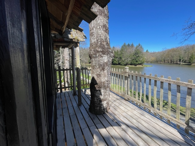 Cette cabane sur pilotis exposée plein sud, dispose d'une grande baie vitrée pour profiter pleinement de la terrasse ouverte sur l'étang.