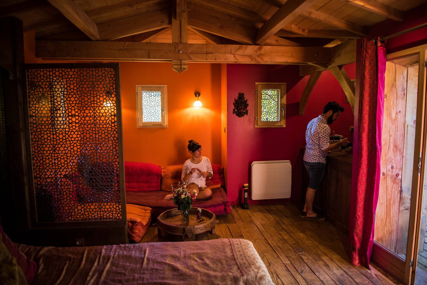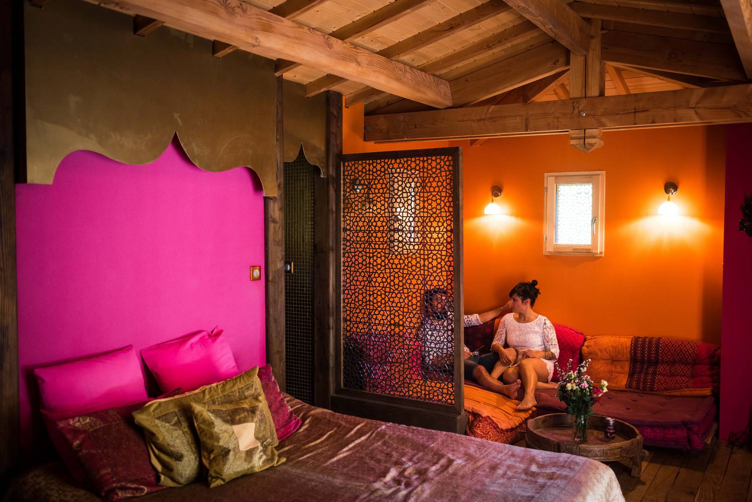 Cabane des Indes (Indian-style treehouse) with a Bollywood ambiance, perched 6m from the ground. This luxurious treehouse for up to 4 people has a bathroom with walk-in shower, a WC, a mini bar, a Nespresso coffee machine and its own private hot tub, surrounded by unspoilt nature and heated to between 37° and 39°. Hair dryer available. Bathrobes and bath towels.