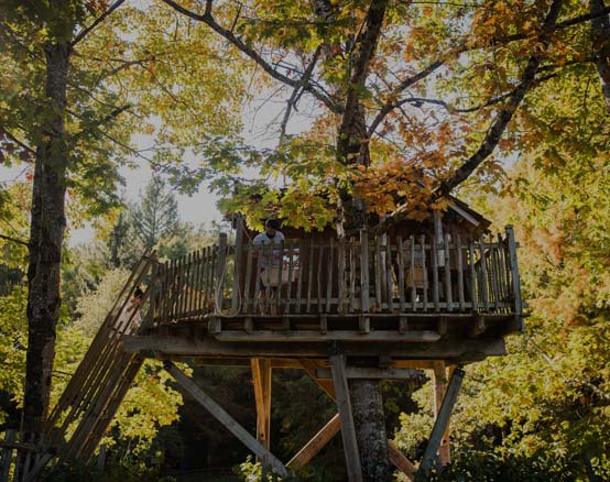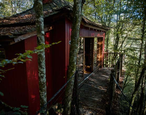 A family treehouse of 18m² which can hold 5 people, perched at a height of 5 metres, reached by a rope bridge and with a terrace of 21m².
